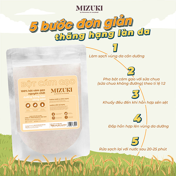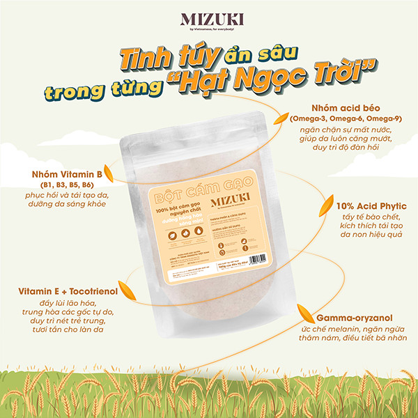Bột cám gạo Mizuki giữ nguyên được toàn bộ thành phần dinh dưỡng của hạt gạo Việt Nam với hàm lượng cao các nhóm vitamin B (B1 ,B3, B5, B6), nhóm acid béo, vitamin E + Tocotrienol… có lợi cho làn da. Thường xuyên sử dụng bột cám gạo Mizuki sẽ giúp dưỡng trắng, hỗ trợ ức chế các sắc tố đậm màu, duy trì độ đàn hồi, loại bỏ tế bào chết và làm mịn biểu bì, mang đến sự trẻ trung đầy sức sống cho làn da.