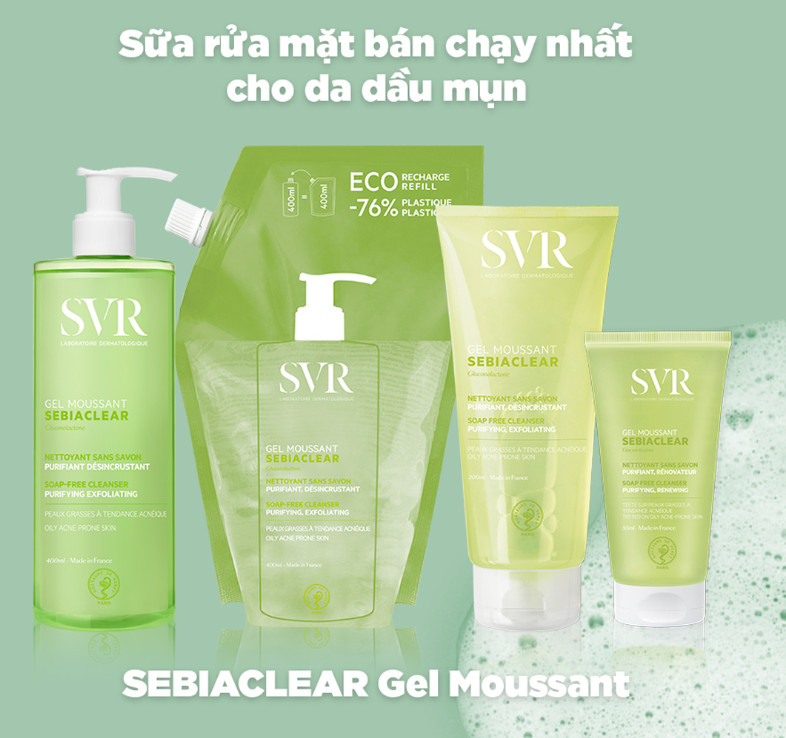 Gel Rửa Mặt SVR Sebiaclear Gel Moussant là sản phẩm sữa rửa mặt dành cho làn da dầu mụn đến từ thương hiệu dược mỹ phẩm SVR của Pháp, với công thức không chứa xà phòng giúp làm sạch, nhẹ nhàng làm thông thoáng làn da. Khả năng tạo bọt mịn giúp loại trừ các chất bẩn và lượng bã nhờn dư thừa mà không làm khô da. Có thể rửa sạch dễ dàng, mang lại một làn da sạch, tươi mát và khô thoáng.