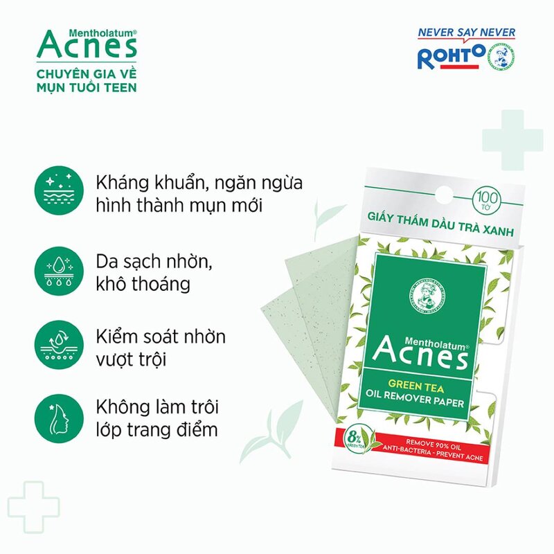 Giấy Thấm Dầu Acnes Trà Xanh 100 Tờ với khả năng hấp thụ dầu thừa hiệu quả bên cạnh đó bổ sung thêm 8% tinh chất trà xanh hỗ trợ ngừa mụn, làm dịu làn da.