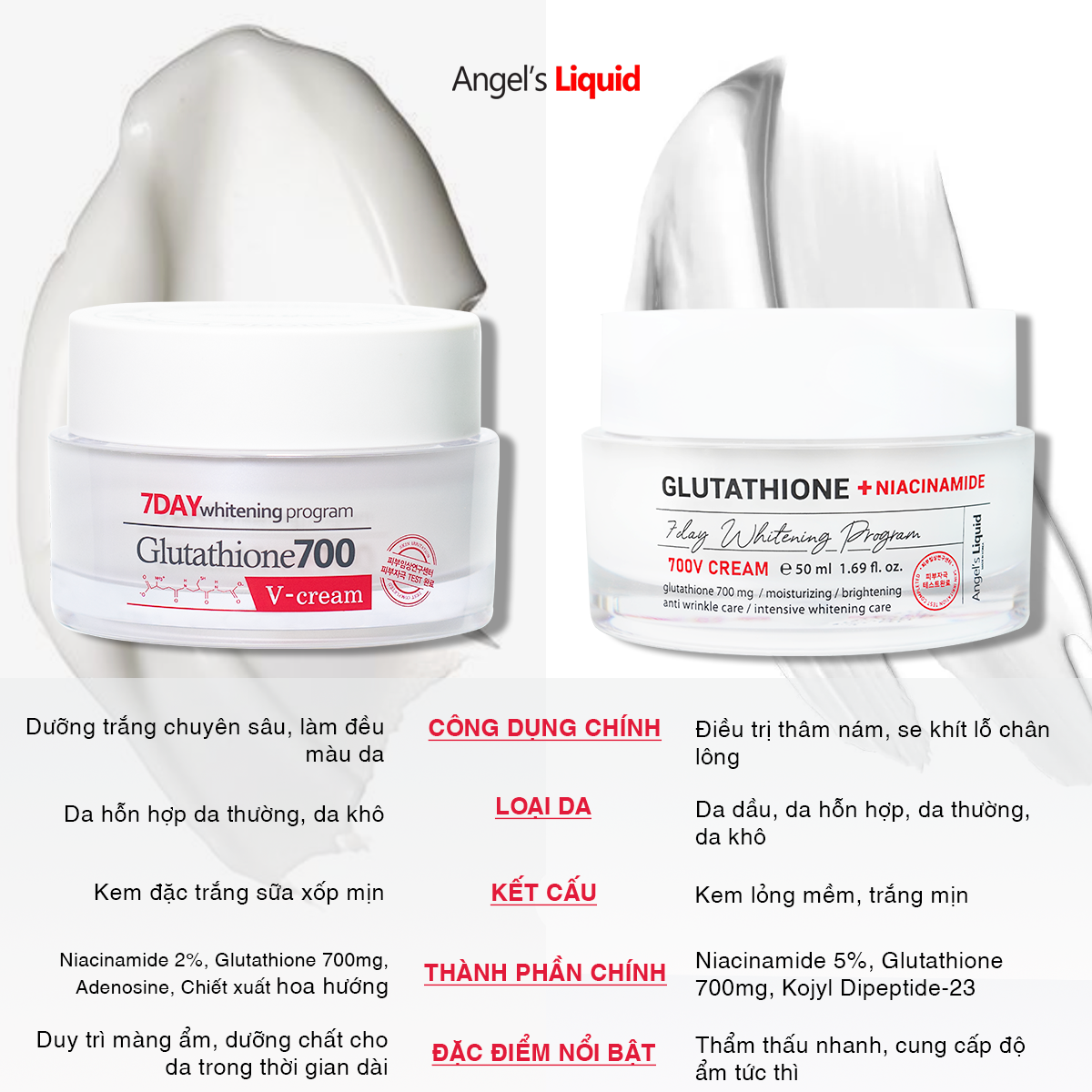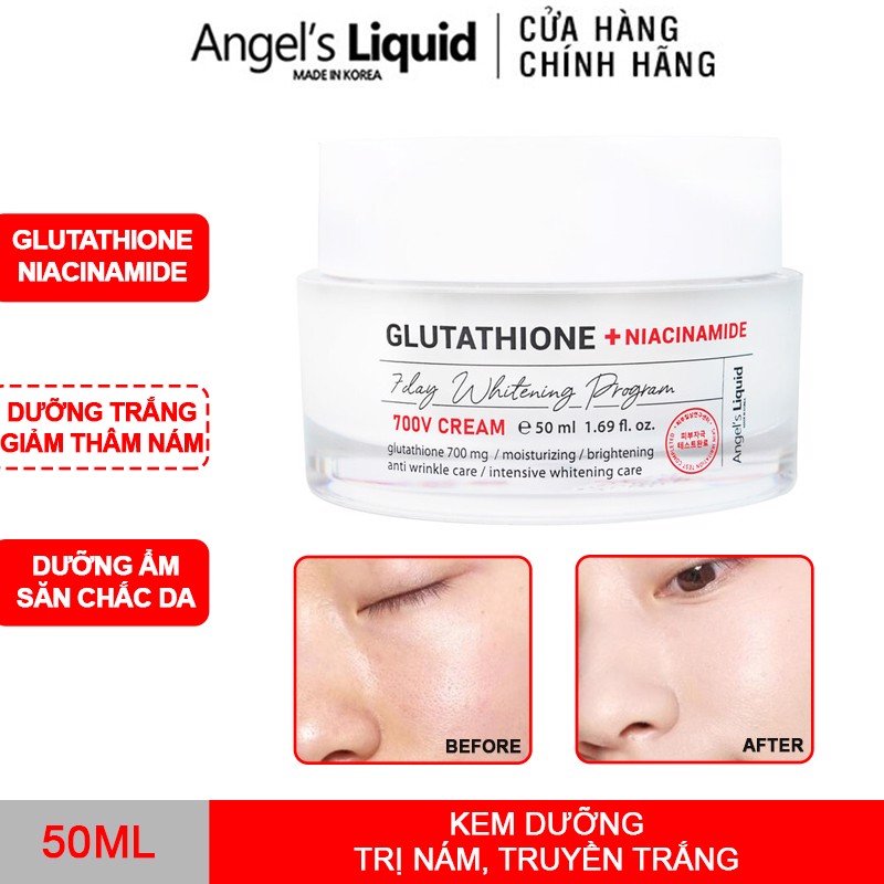 Kem Dưỡng Angel's Liquid Làm Sáng Da, Mờ Thâm 50ml là sản phẩm kem dưỡng đến từ thương hiệu Angel's Liquid của Hàn Quốc, có chứa nano L-Glutathione dưỡng da trắng sáng, xóa mờ thâm, sạm nám, làm đều màu da, tăng cường chống oxy hóa. Kết hợp Niacinamide và Sodium Hyaluronate (HA) thu nhỏ lỗ chân lông, kiểm soát tình trạng dầu mụn, tăng sinh collagen và elastin giúp ngừa lão hóa, đồng thời cấp ẩm sâu giúp da căng bóng chuẩn Hàn. Hiệu quả sau 7 ngày sử dụng đã được kiểm chứng bởi viện nghiên cứu da Hàn Quốc.