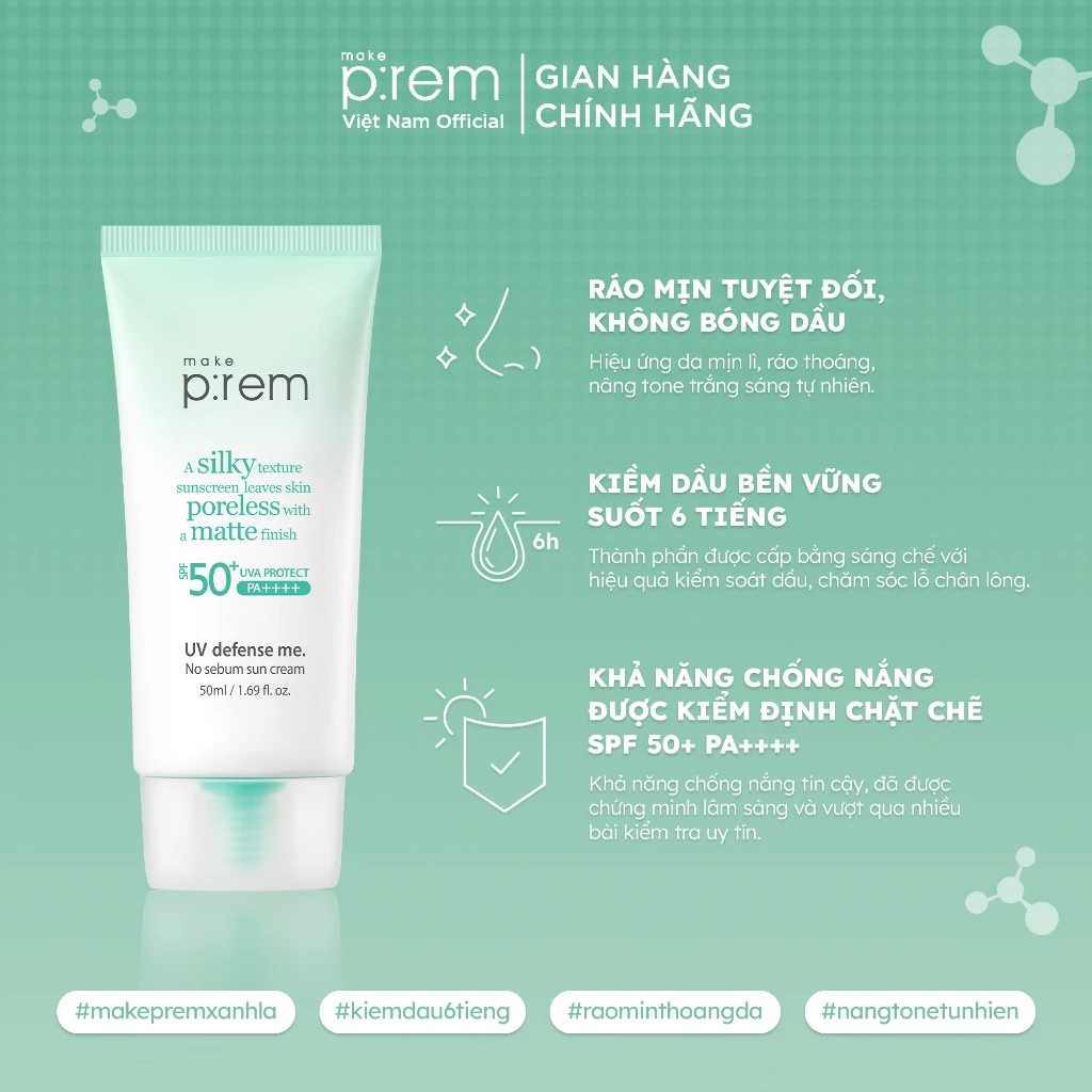 Kem Chống Nắng Vật Lý Kiềm Dầu Make p:rem Uv Defense Me. No Sebum Sun Cream 50ml là sản phẩm chống nắng da mặt đến từ thương hiệu Make p:rem Hàn Quốc. Với khả năng bảo vệ da khỏi tia cực tím đã được kiểm nghiệm cùng các thành phần được cấp bằng sáng chế giúp kiểm soát bã nhờn hiệu quả, cho làn da mịn màng không bóng nhờn.