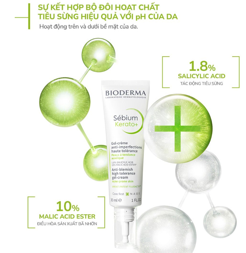 Công thức kết hợp bộ đôi hoạt chất tiêu sừng (axit salicylic và axit malic ester) hoạt động trên và dưới bề mặt của da, cho hiệu quả cải thiện mụn và vết thâm rõ rệt chỉ sau 2 ngày. Đồng thời, Sébium Kerato+ giúp dưỡng ẩm 8h, làm đều màu da, giảm bã nhờn và giảm kích ứng trên da với khả năng dung nạp cao lên đến 97%.