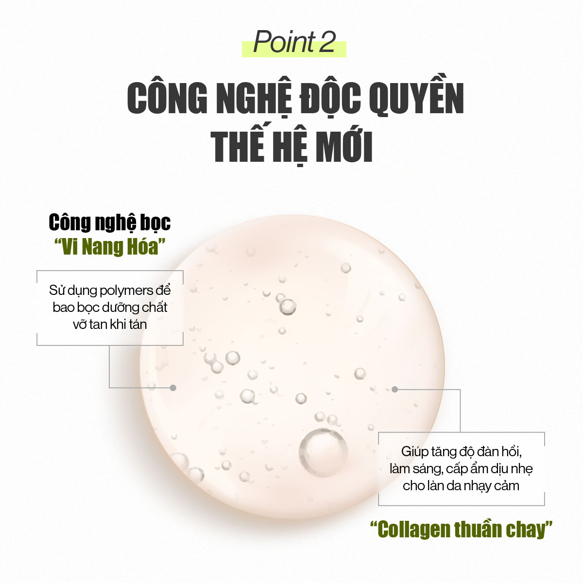 Hiệu ứng da glow khỏe, không nhờn rít: Chứa viên nang collagen thuần chay dưỡng da, vỡ tan khi tán để giải phóng lớp tinh chất cấp ẩm. Kết cấu thông minh giúp da glowy, mềm mại nhưng vẫn thoáng nhẹ, không bết rít, không bí tắc