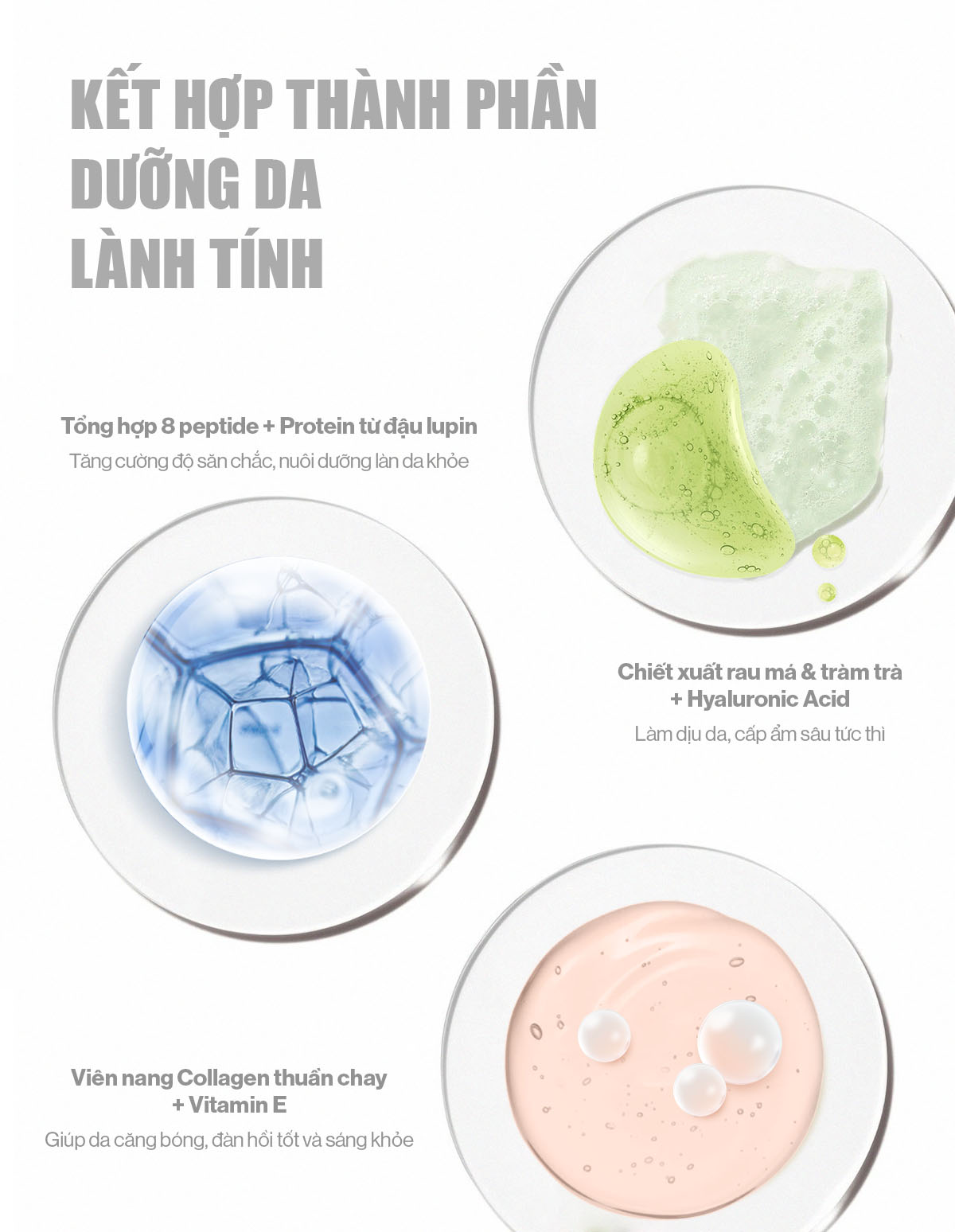 - Dưỡng da: Làm dịu & dưỡng ẩm (Pennywort Juice, Tea Tree Leaf Extract + Dual Hyaluronic Acid), làm săn chắc & nuôi dưỡng (8-PEP Complex, Hydrolyzed Lupin Protein),