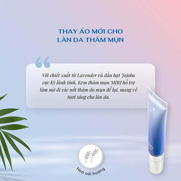 Với chiết xuất từ Lavender và dầu hạt Jojoba cực kỳ lành tính, kem thâm mụn MIRI nhẹ nhàng làm mờ đi các nốt thâm do mụn để lại, ngăn ngừa tình trạng lây lan, viêm nhiễm và nhanh chóng hồi phục tái tạo mang lại vẻ tươi sáng cho làn da