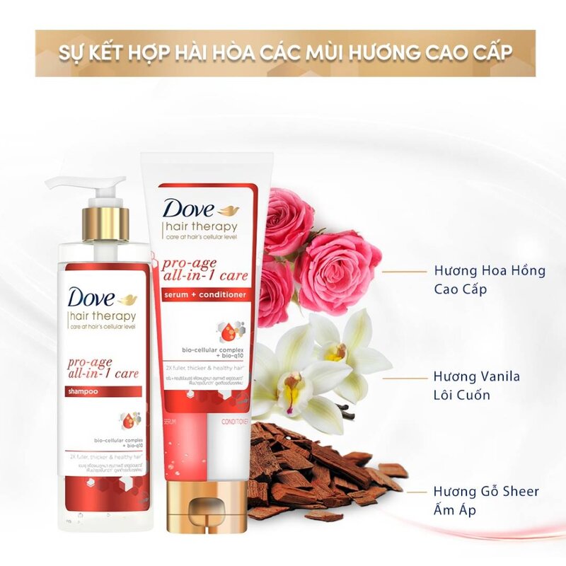 Dove Hair Therapy Pro-Age All-In-1 Care Serum + Conditioner với hợp chất Bio-Cellular Complex' + Bio-Q10. Công thức giúp thấm sâu đến tầng tế bào của tóc* cùng sự nuôi dưỡng vượt trội. Cảm nhận mái tóc phồng dày và chắc khỏe gấp 2 lần ngay sau khi sử dụng.