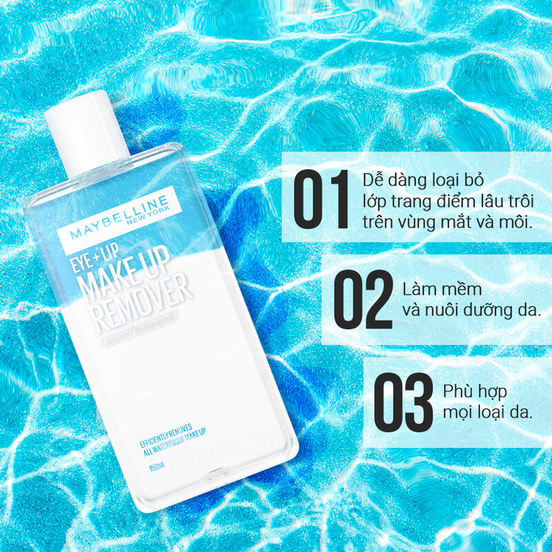 Nước Tẩy Trang Mắt Môi Maybelline Lip & Eyes Make Up Remover là sản phẩm tẩy trang chuyên dụng mắt, môi đến từ thương hiệu trang điểm nổi tiếng Maybelline của Mỹ, với công thức độc quyền nước tẩy trang 2 lớp với dầu và nước, kèm theo các phân tử nhỏ len sâu giúp làm sạch dễ dàng lớp trang điểm lâu trôi. Nước tẩy trang loại bỏ lớp trang điểm lâu trôi một cách nhẹ nhàng, hiệu quả và nhanh chóng, kể cả các lớp trang điểm siêu lì. Nay với phiên bản bao bì mới, làm 100% từ nhựa tái chế.