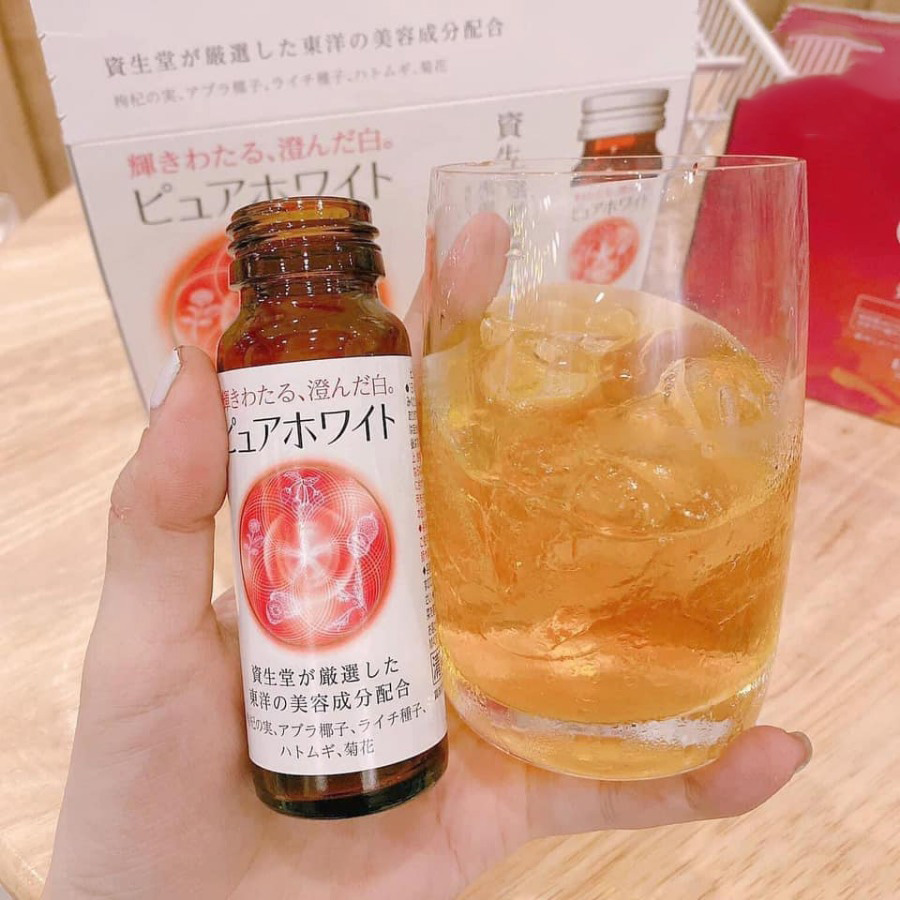 Nước Uống Shiseido Collagen Pure White Trắng Da, Giảm Nám Nhật Bản 50ml gồm 10 lọ, mỗi lọ 50ml là thực phẩm chức năng đặc biệt được người Nhật rất ưa chuộng giúp cải thiện làn da căng bóng, trắng sáng tự nhiên bằng cách uống mỗi ngày. Dựa vào bảng thành phần có thể thấy được hàm lượng vitamin C khá cao, nhiều thành phần chiết xuất từ tự nhiên nên nếu sử dụng đúng cách thì chỉ khoảng 3-4 tuần da sẽ đạt được những hiệu quả rõ rệt như da chắc khỏe, thâm nám, sạm đen được cải thiện.