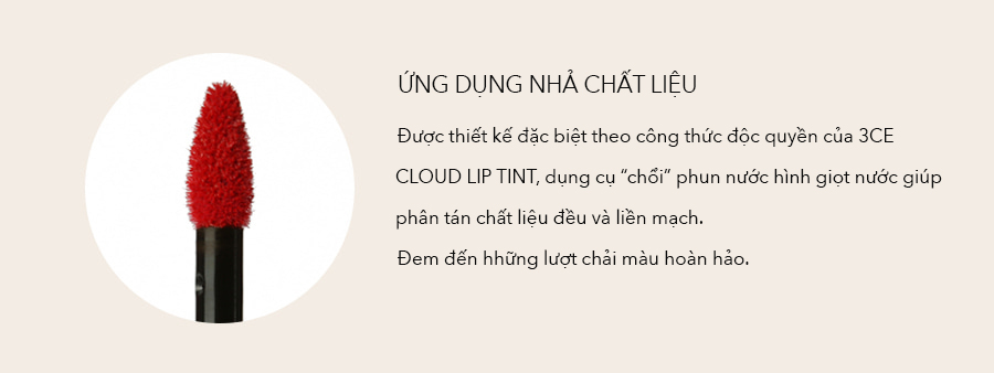 "Nhẹ như áng mây, mềm mại và mịn màng" chính là Son Kem Lì 3CE Cloud Lip Tint đến từ thương hiệu Hàn Quốc 3CE. Cây son vuông dài và đầu nắp ánh kim sang trọng luôn là sự lựa chọn hàng đầu bởi sức hấp dẫn khó cưỡng từ chất liệu đến thiết kế. Chất son kem mềm mại, sau khi khô lại không quá lì mà vẫn có giữ được độ trơn mịn cho đôi môi.
