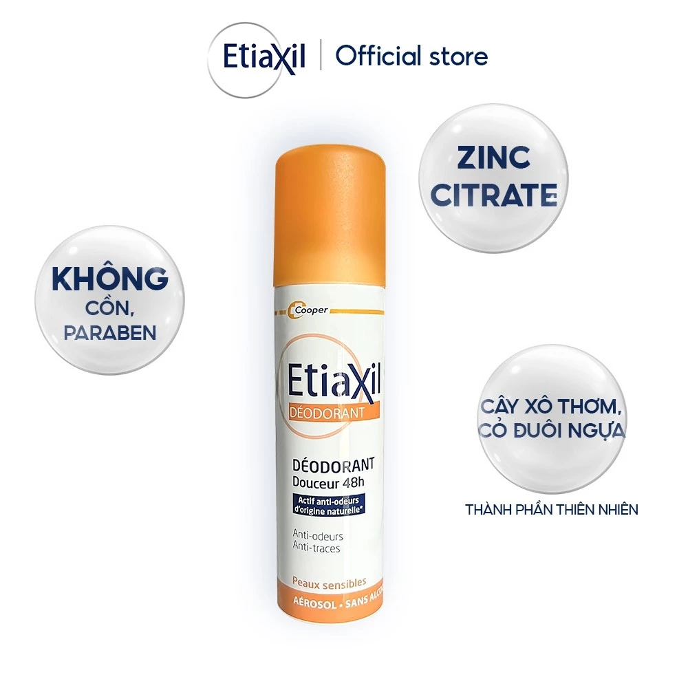 Xịt Khử Mùi Etiaxil Deodorant Douceur 48H Aérosol (Màu Cam): chiết xuất từ thực vật và không chứa muối nhôm, dùng được cho cả mẹ bầu và cho con bú. Mùi hương cam quýt mang lại cảm giác tươi mát cả ngày dài.